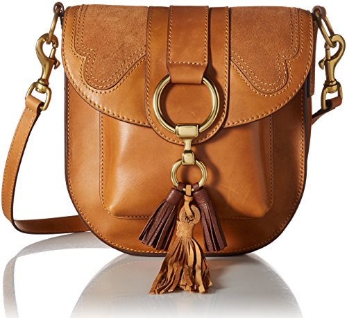 Burnished leather saddle bag with suede western appliques, harness ring detailing, and tassels