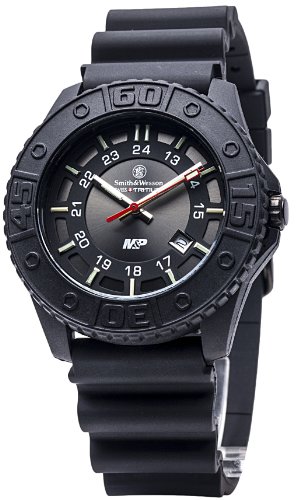 -. Binding : Watch -. Brand : Smith & Wesson -. Color : Black -. Department : mens -. EAN : 3040013516508 -. Feature : Black lightweight polycase, black dial, white numbers and silver and red hands / Equipped with a tritium light source that provides over 20-years of constant glow / Water resistant up to 100-meters (330-feet) / Includes a black rubber band, rotating bezel, stainless steel caseback and date display / Comes with a 1-year limited warranty -. Label : Smith & Wesson -. Manufacturer : Smith & Wesson -. Model : SWW-MP18-BLK -. MPN : SWW-MP18-BLK -. NumberOfItems : 1 -. PackageQuantity : 1 -. PartNumber : SWW-MP18-BLK -. ProductGroup : Watch -. ProductTypeName : WATCH -. Publisher : Smith & Wesson -. ReleaseDate : 2013-09-06 -. Studio : Smith & Wesson -. Title : Smith & Wesson Men's SWW-MP18-BLK M&P Swiss Tritium H3 Black Dial Rubber Band Watch -. UPC : 024718100838