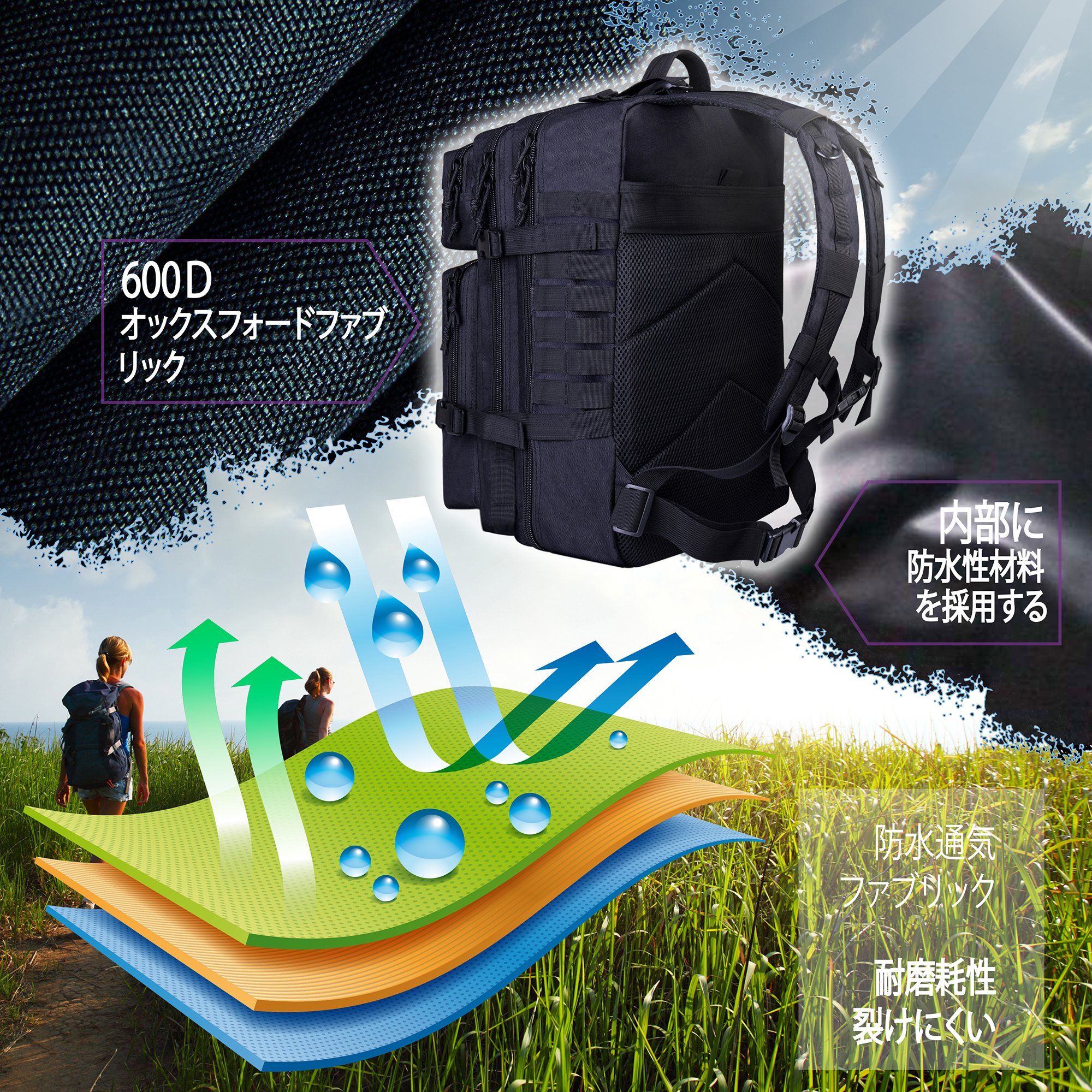 Large capacity, functionality, abrasion resistance, waterproofness, breathability