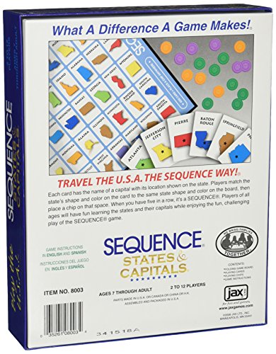 -. Feature : A great game to enjoy with your family! / 2 to 6 Players / Includes folding game board, cards, chips and game instructions in both English and Spanish. / Travel the U.S.A the Sequence way! / Learn you states their capitals!