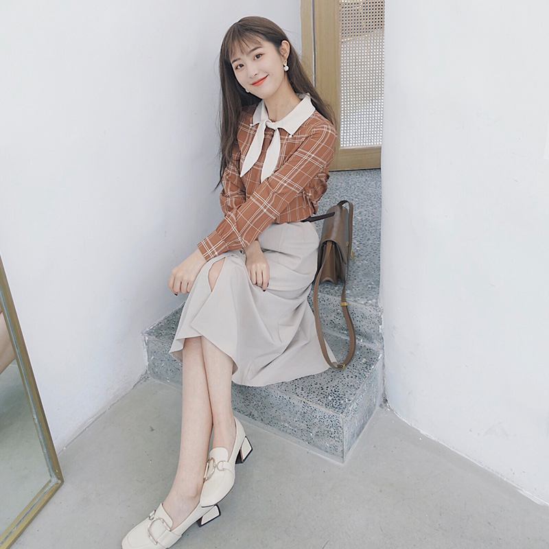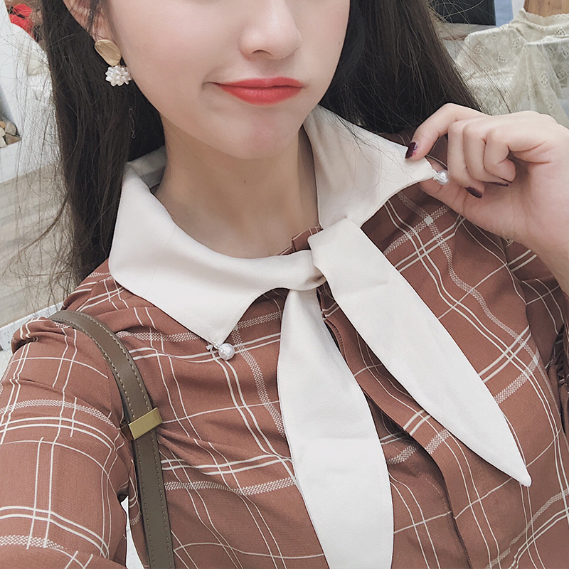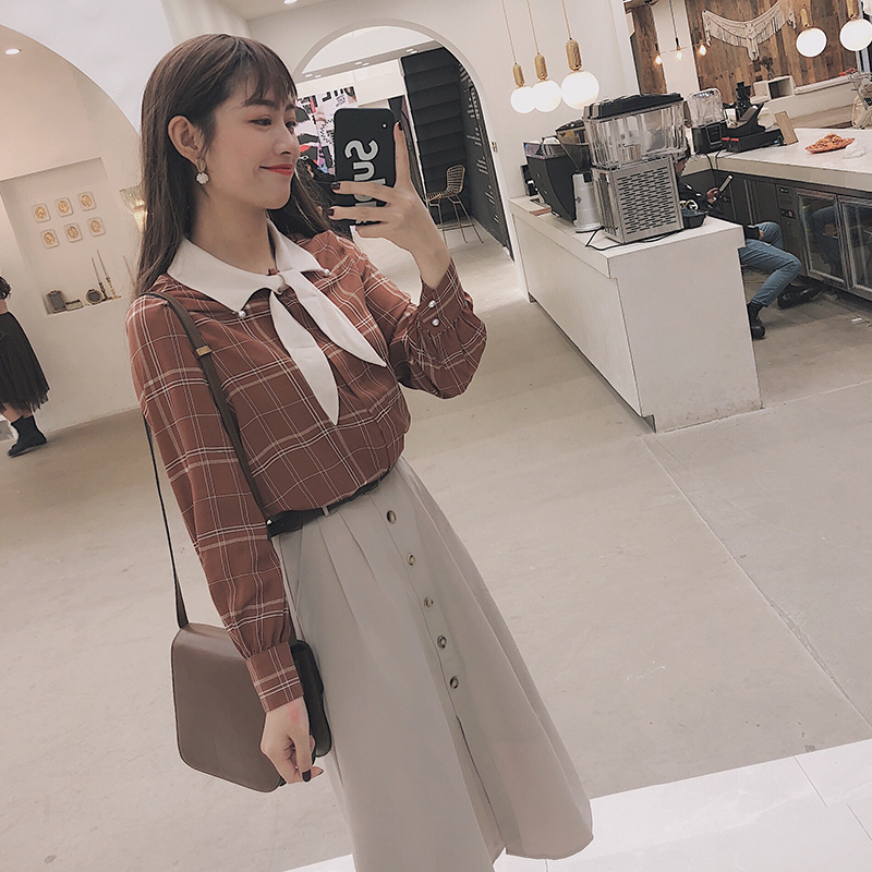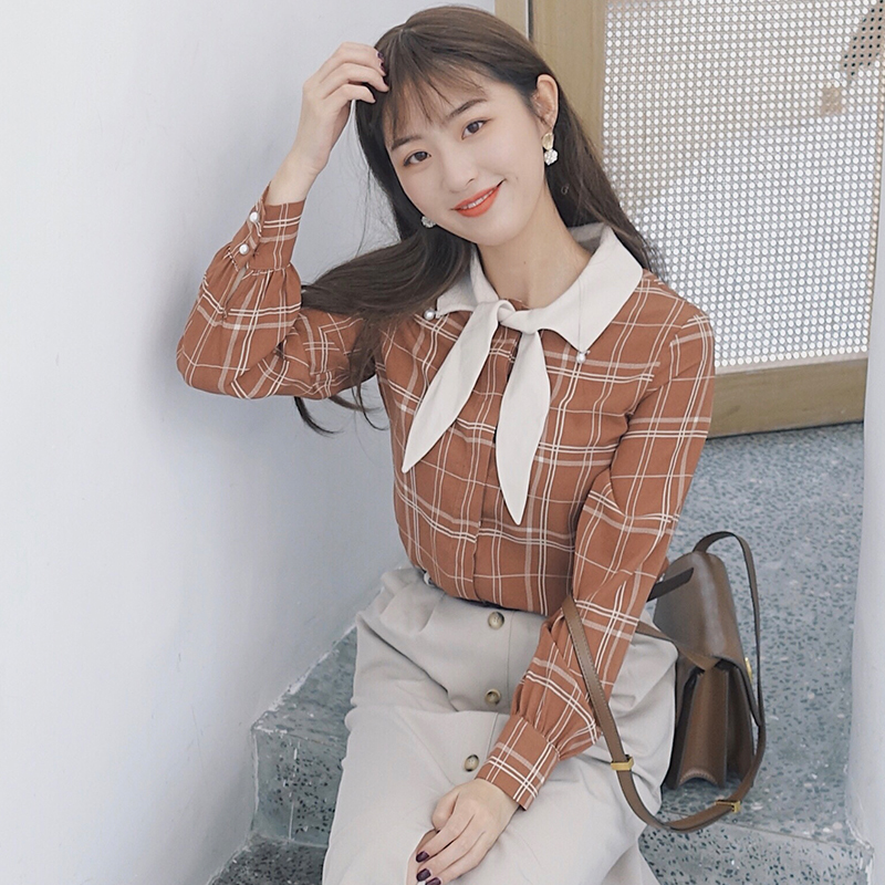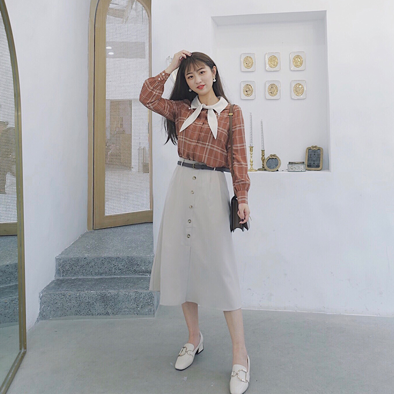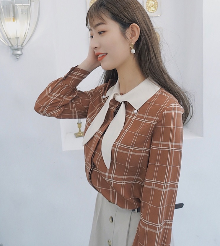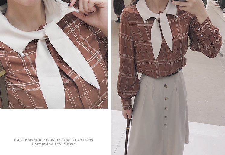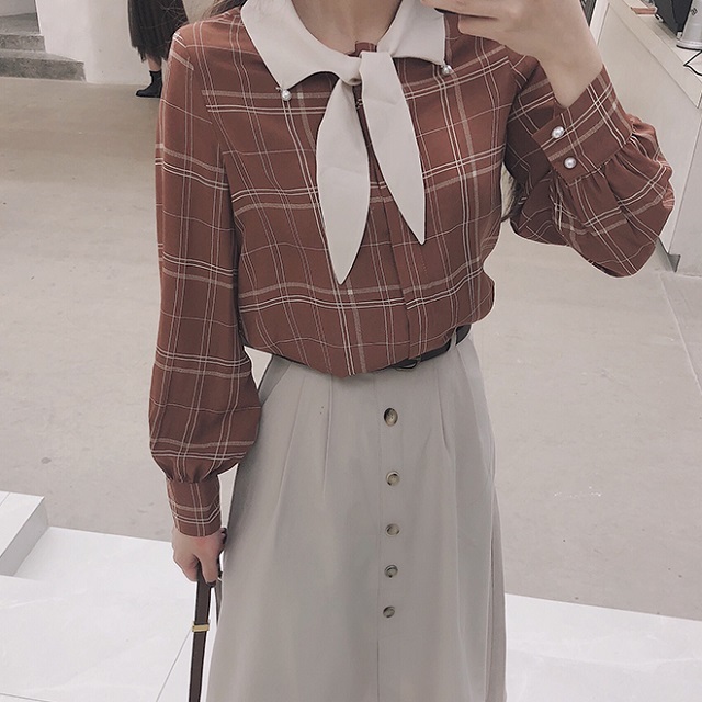 大人可愛いバイカラー襟のブラウスとトレンドの前ボタンデザインを