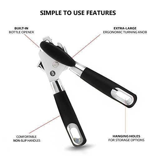 ? PROBLEM SOLVED - The problem with other can openers is that they are not easy to use and they can leave sharp edges on the can. Our can opener solves those problems. How? It has the perfect combination of sharp cutting blades, large soft turning knob and ergonomical grips which means that it opens cans easily and safely leaving only smooth edges on the can.