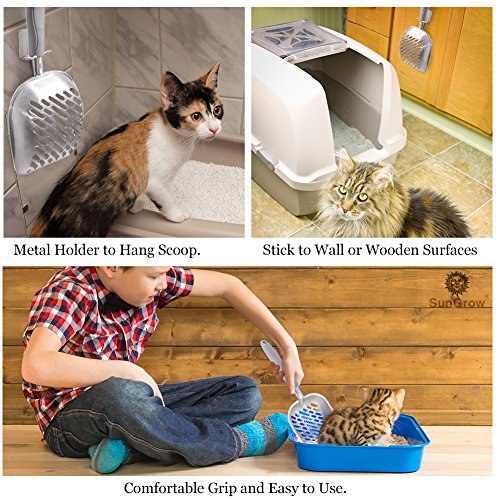 Made with a solid rubber core, its heavy duty handle also does not break, bend, or even flick. It is efficient in getting rid of cat poop because the ergonomic handle lets you hold and keep your hand away from the soiled litter. Also, the rubber handle reduces the likelihood of fatigued hands if you have more than one cat or pet, because maintaining your litter boxes becomes such a breeze! Storage of the scoop is no more a hassle as you can now simply hang it on the sturdy holder provided.