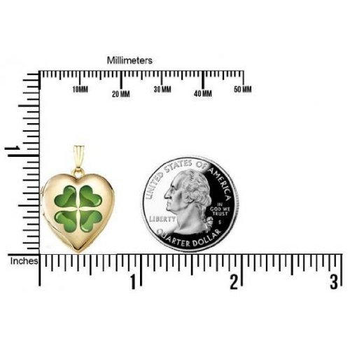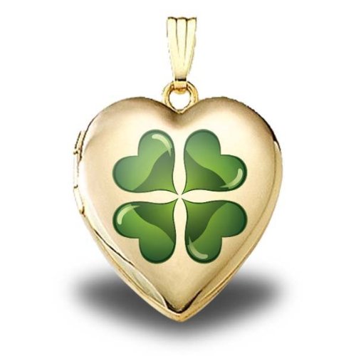 -. Title : Solid 14K Yellow Gold "Green Four Leaf Clover" Sweetheart Locket 3/4 Inch X 3/4 Inch in Solid 14K Yellow Gold