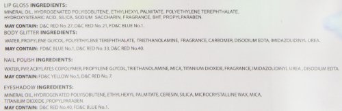 -. Feature : 2 body glitter, 2 lip glosses, 2 nail polishes, 1 eye shadow compact / Asset flavors / Great gift / Fun Set / Plastic case with marabou handle