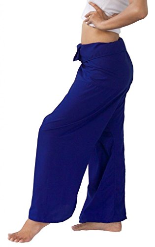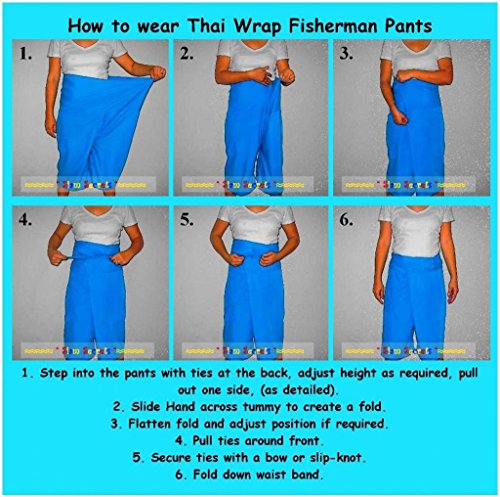 Thai Fisherman Pants have a very wide waist with a belt that ties from the rear. Simply step into the pants, pull the waist out to one side wrap the extra fabric around to the front and tie the belt. Length can be adjusted by folding over the top of the pants! 0