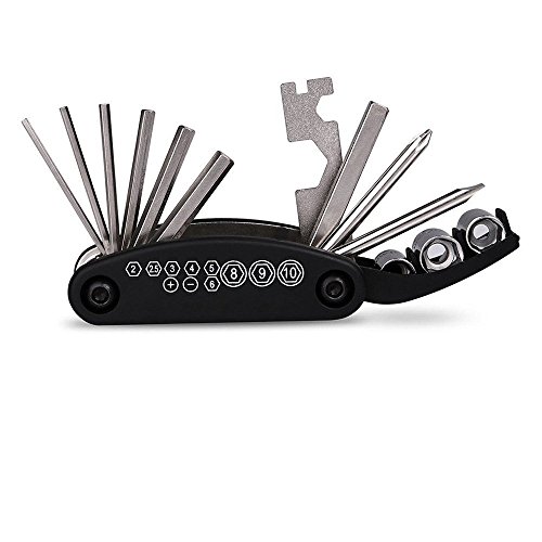 Features Features: ? 6 pcs Hex Key: 2mm, 2.5mm, 3mm, 4mm, 5mm, 6mm ? 3pcs Socket hex wrench: 8mm, 9mm, 10mm ? 1pcs Flat Screwdriver ? 1pcs Philips Screwdriver ? 3pcs Open Spanner: 8mm, 10mm, 15mm ? 1pcs Spoke Key: 14g Size: Approx Item: 85x42x24mm Color: Black