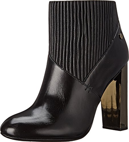 Modern ankle boot featuring pleated ribbing at shaft and block heel in scratched foil finish