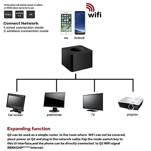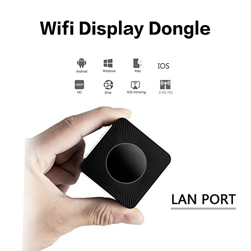 -. Feature : ?¡¾NEW UPGRADED VERSION¡¿---Compared with the old ones, this wifi display dongle adopted LAN port, completely say goodbye to those tedious step of the old versions and enjoy the experience of plug and play, only 2 steps. / ?¡¾2.4G & 5 G DUAL-BAND¡¿---It used 2.4G & 5G dual-band WIFI, Built-in 5G WLAN module(depend on WIFI router), more stable, anti-interference stronger, less caton; and also can be used as a simple router to expand wifi signal. / ?¡¾1080P HIGH RESOLUTION & LED INDICATOR¡¿---Full HD 1080P, equipped with AV /HDMI output with faster processing speed offer you a perfect home theater experience, and LED indicates the different modes of breathing and rotating effects. / ?¡¾MULITIMODE SELECTION¡¿---This screen mirroring adapter support Miracast/Airplay Mirror/DLAN and other intercommunication agreement, able to synchronously cast videos/photos/web browser/office files/live movie from iPhone/Android Smartphones to tablet PCs, large-screen TVs, and projectors. / ?¡¾EASY TO USE & WARRANTY¡¿---No App or driver required. Only 2steps to enjoy 1080p HDMI video on large screen: Plug LAN port->Mirroring£¨in the same LAN environment), if you have any question or hesitation about this item, please free contact u, we will be always there until your problem has been solved.