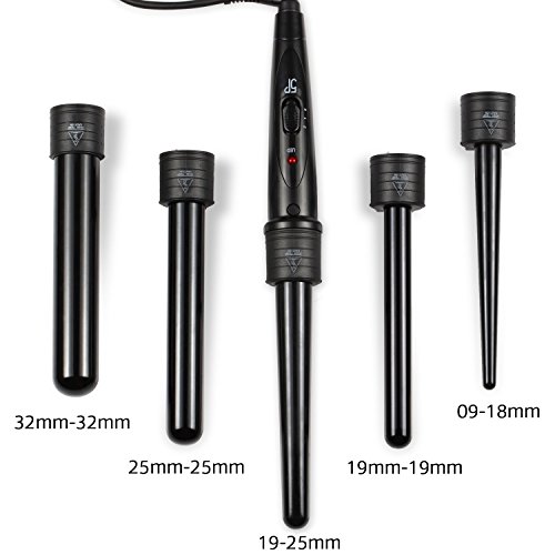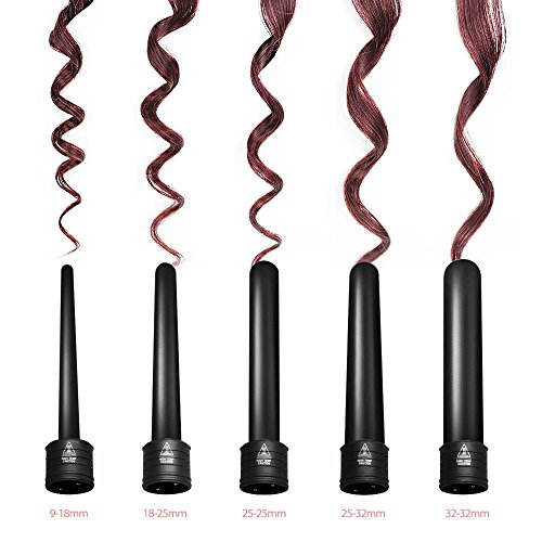 5 IN 1 Interchangeable Ceramic Barrels: Different size ( 09-18mm, 19-19mm, 18-25mm, 25-25mm, 32-32mm), meets your different curling style needs, such as big curls, waves, corkscrew curls and ringlets and bounce.