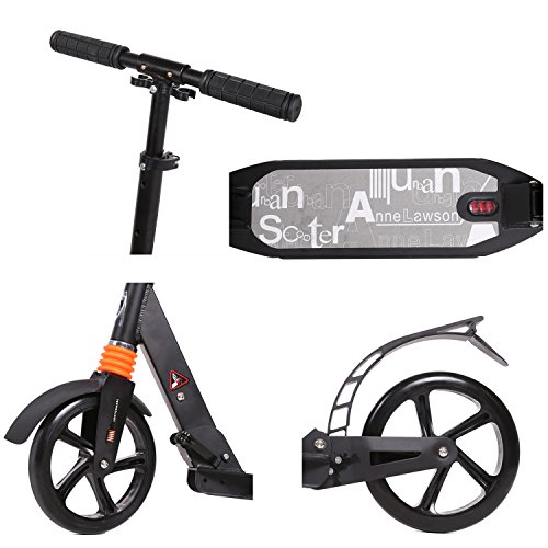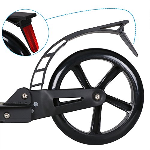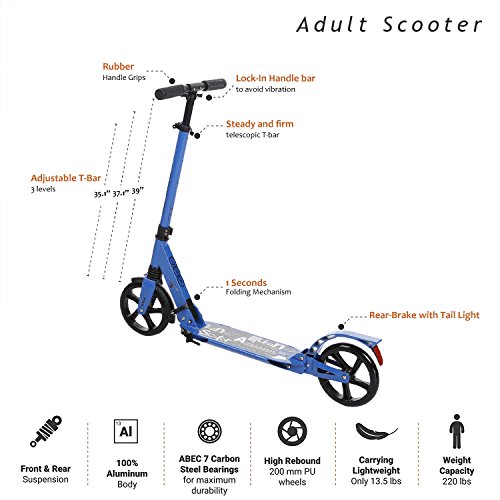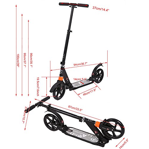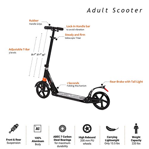 -. Brand : eshion -. Feature : Lightweight - The material is Aluminum Alloy, which is easy to carry and transport. Support riders up to 220lbs / Foldable-Innovative folding mechanism for quick storage and transportation / Safe-Two damping sP.R.Ing equipment safe scooter tail light Give you a better skateboarding experience / Adjustable-The height adjustable design makes the scooter suit for any kinds of people.3 types of height : 35.1, 37.1, 39inch / High-speed oversized wheels- Superior traction and smoothness over any terrain. And take care when you are riding the scooter and keep the speed you can control -. IsAutographed : 0 -. IsMemorabilia : 0 -. ProductGroup : Sports -. ProductTypeName : OUTDOOR_RECREATION_PRODUCT -. Title : Adult Kick Scooter with Big Wheels & Rear Brake with Tail Light & Height Adjustable & 1 Seconds Folding & Lightweight & 220 lbs Weight Capacity (US Stock)