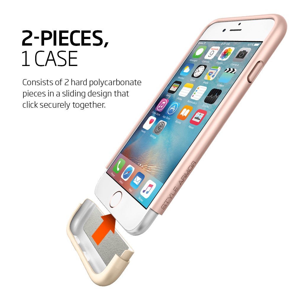 Spigen's Style Armor offers your iPhone 6s the perfect amount of decor with a smart 2 piece design in vivid colors. The hard polycarbonate case with a soft inner lining ensures all sides are covered in a two tone palette that brings mini alism to the forefront for a trendy appearance that hugs the phone comfortably. Compatible with iPhone 6 (2014) / iPhone 6s (2015).