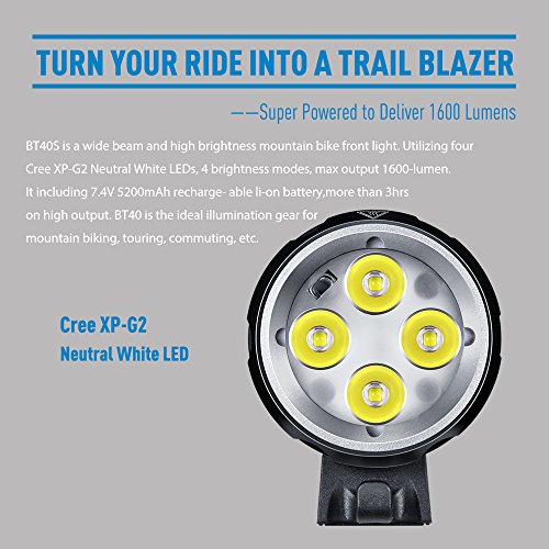 Revtronic BT40S is a wide beam and high brightness mountain bike light. Utilizing four Cree XP-G2 Neutral White LEDs, four brightness modes, max output 1600-lumen. It including 7.4V 5200mAh rechargeable li-on battery,more than 3hrs on high output. BT40S is the ideal illumination gear for mountain biking, touring, commuting, etc. output. Especially 4 selectable Modes: 1. Turbo - for Downhill 2. High - for Mountain biking 3. Med - for Crossing 4. Low - for Commuting TOP FEATURES: - Digitally regulated output-maintains constant brightness. - Overheat protection function. - LED Indicator displays remaining battery capacity. - Quick to attach and detach using O-ring mounting straps sized for 20mm-35mm handlebars. - Made of durable aircraft-grade aluminum. TOP BENEFITS: - GENTLE BEAM. You will NOT feel visual fatigue after a long riding. - NEUTRAL WHITE LED. Best LED color temperature for outdoor activities. - HELMET MOUNT. It transfer the bike light to helmet light. - FLOOD LENS. You always need a flood light when camping/reading, this accessory is a good solution. ENJOY REVTRONIC EXCLUSIVES: - Premium Customer Service 24/7 support. - 2 Years Warranty Hassle Free 100% Money Back Guarantee. - High Quality Prime Materials frequently inspected and tested. SAFTY TIP: BUY TWO FOR HANDLEBAR AND HELMET!! 0