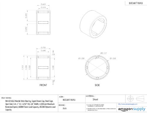 INA SCH1612 Needle Roller Bearing, Caged Drawn Cup, Steel Cage, Open End, Inch, 1" ID, 1-5/16" OD, 3/4" Width, 11000rpm Maximum Rotational Speed, 6400lbf Static Load Capacity, 4500lbf Dynamic Load Capacity
