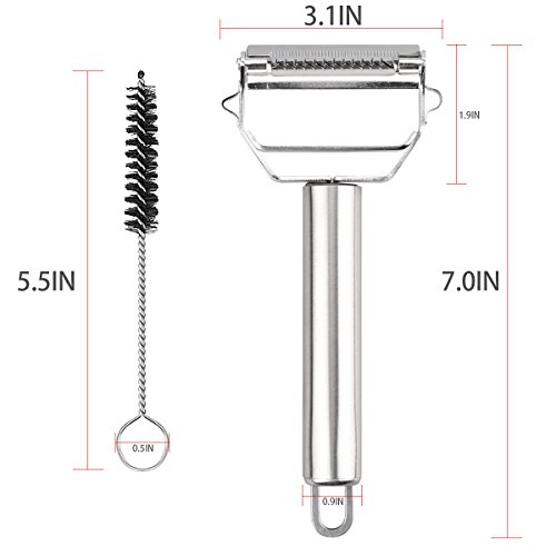 EASY CLEAN BRUSH: Enjoy a free pipe-cleaner styled brush to easily clean this multi-use peeler. It is also dishwasher safe for added convenience. The easy grip handle is also stainless steel.