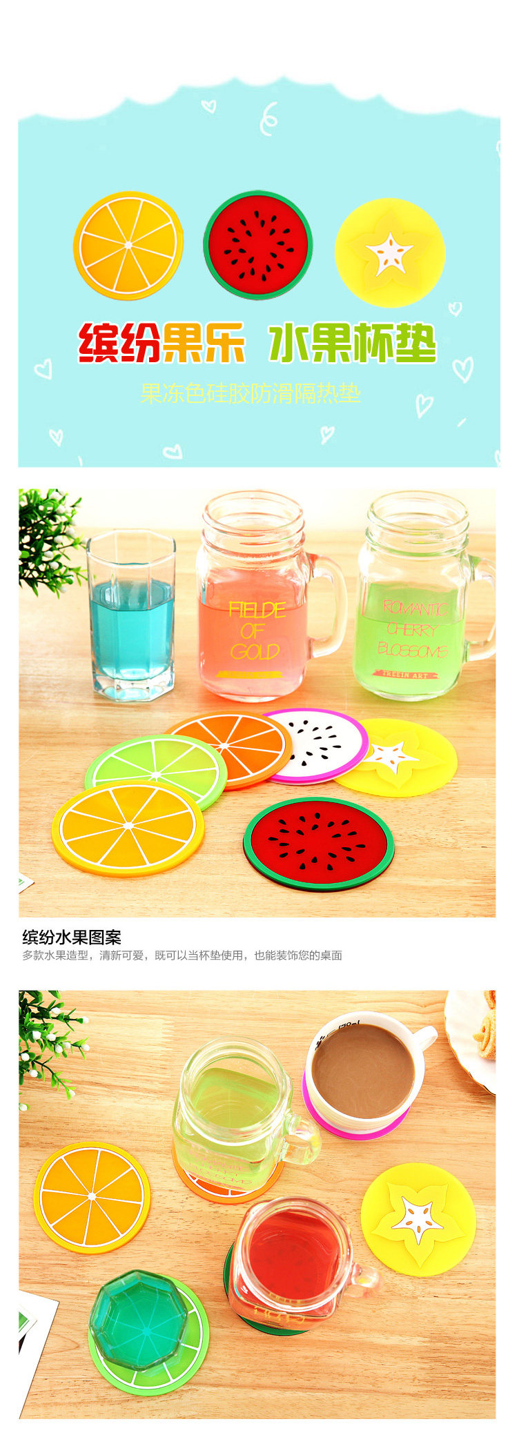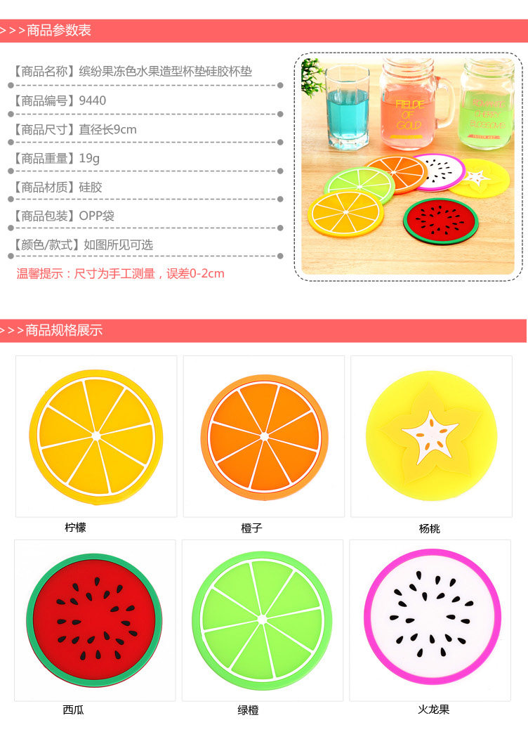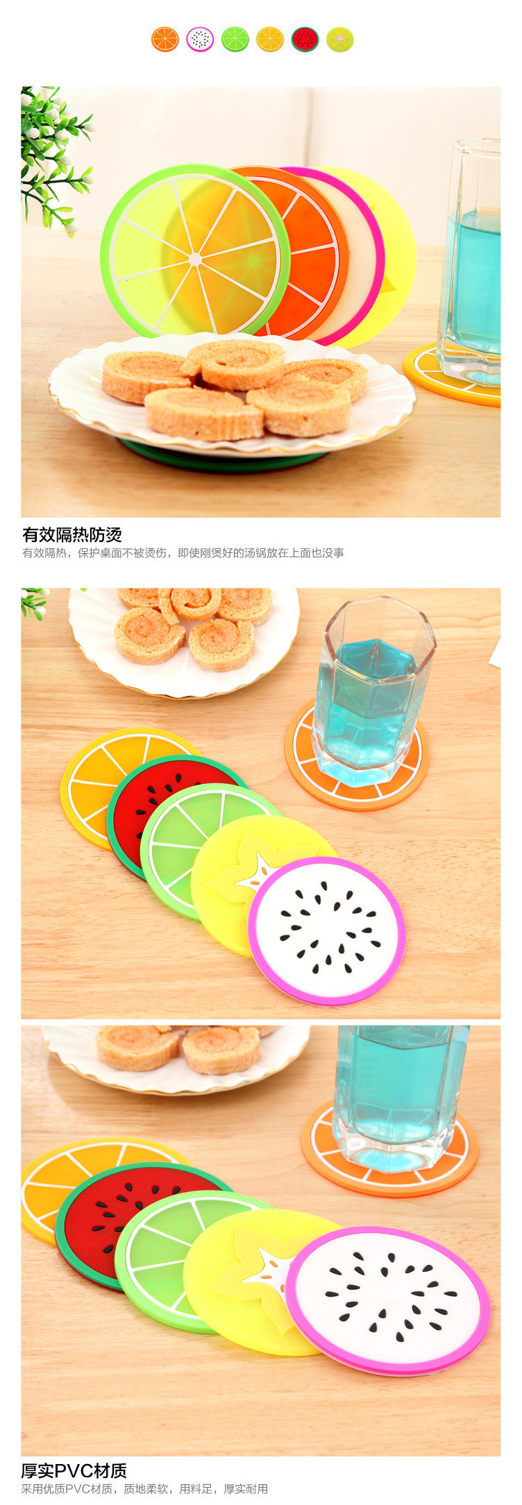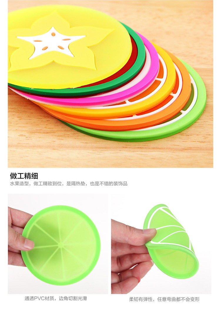 A variety of fruit shape, fresh and lovely, high quality PVC material, texture, flexibility, good workmanship, solid and durable, is also a good decoration coasters.