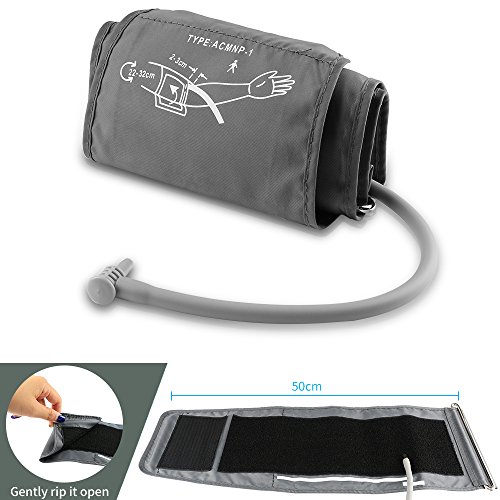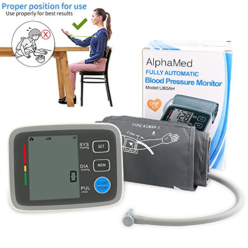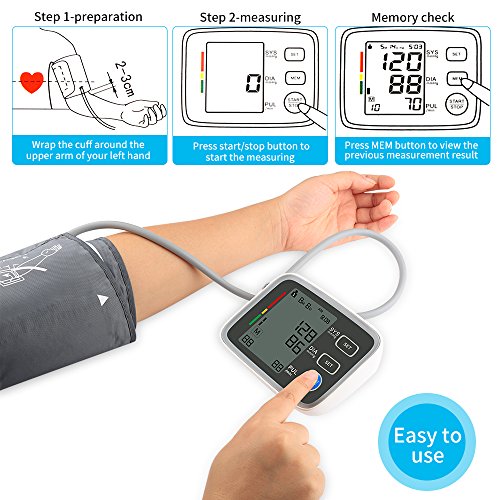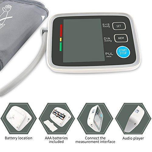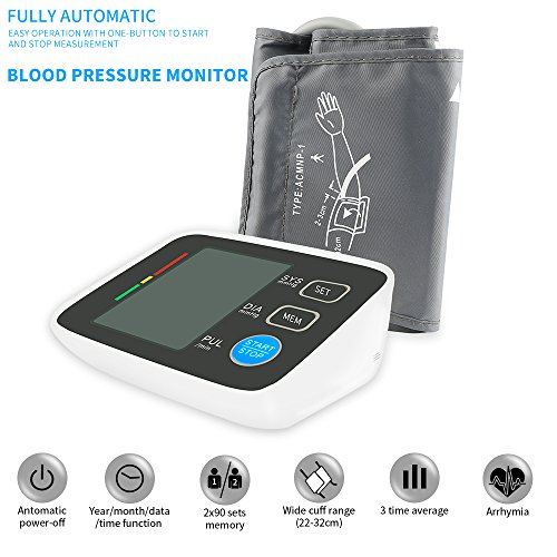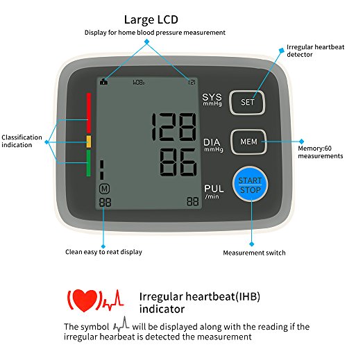 Specifications 1) Measurement range: Pressure 0-229 mmHg(0-39.9kPa), Pulse Pulse ±5% of reading,40-199 pulse/min 2) Pulse Range: 40-199 beats per minute 3) LCD Size: 2.36"x3.6" 4) Cuff Size: Medium to Large, 8" - 16" 5) Product Dimensions: 5.5 x 5 x 2 Inch 6) Power Source: 4 AAA Batteries (Battery not included)