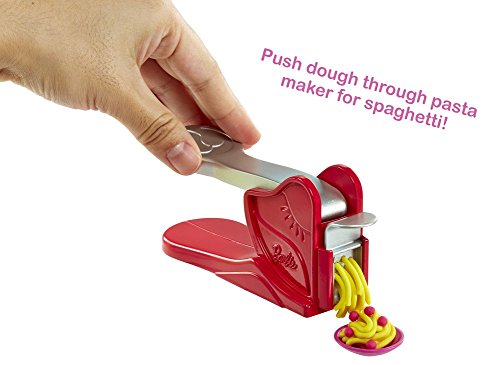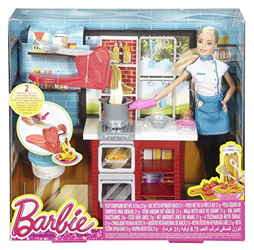 With the Barbie Spaghetti Chef play set, you can cook up a pasta feast! Young chefs can explore restaurant ownership and culinary careers with Barbie doll while cooking up a spaghetti and meatball dinner using pasta and meatball dough! Two dough colors are included along with an easy-to-use tool that creates pasta noodles with a simple push of the lever. Insert your selected dough into the pasta maker, then push the lever down to move the dough through the opening. "Cook" up the pasta noodles in the pot on the stove in the kitchen with brick-detailed background stovetop, oven, counter and cabinet. Then twist the noodles into a bowl and roll meatballs to top off the spaghetti dish! Shelves and hooks hold accessories for storage and display; themed decals add character and storytelling fun. Additional pieces take the meal from prepping to plating with cookware and flatware for complete play. Barbie doll is ready to heat up the kitchen in a chef-inspired top with apron detail, black pants, matching shoes and pink oven mitt. Play set includes Barbie doll wearing fashion and accessories, stovetop/oven/counter/shelving unit, dough-shaping tool, two colors of dough and dough container, an oven mitt, one sauce pan, one colander, one serving spoon, one pasta server, one pasta bowl and one cup. Doll cannot stand alone. Colors and decorations may vary.Feature