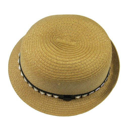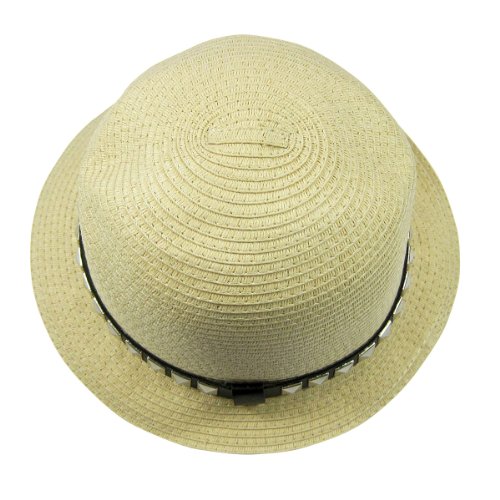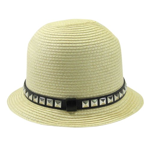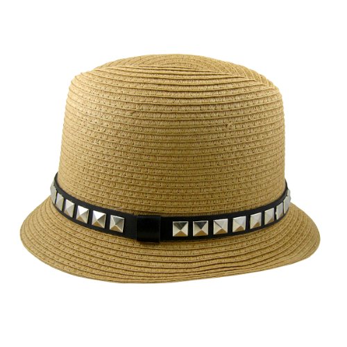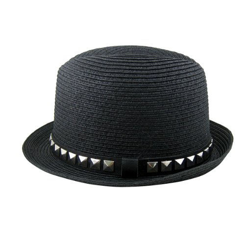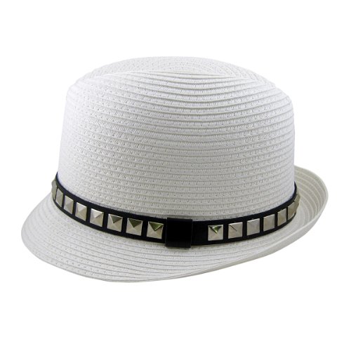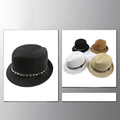 -. Binding : Apparel -. Brand : EchoMerx -. Department : womens -. Feature : Straw fedora hat is a perfect hat for you this summer / Black vinyl band with studs create a very trendy look for men and women / One size fits most / Made of 100% paper / Measures 57cm, crown 5"H, brim 1.5"W -. ProductGroup : Apparel -. ProductTypeName : HAT -. Title : Straw Hat Fedora with Studs
