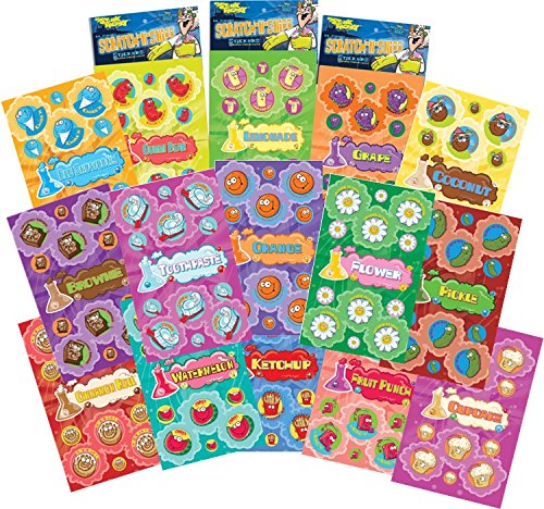 -. Feature : Scratch N Sniff Stickers 15-Pack- Orange, Gummi Bear, Brownie, Watermelon, Toothpaste, Pickle, Lemonade, Cupcake, Grape, Flower Power, Ketchup, Cinnamon Roll, Blue Snowcone, Fruit Punch, Coconut / What enables Scratch-N-Sniff Stickers to last so long? Micro-encapsulation is a process where fragrance is captured into a tiny bubble. The bubble is then applied to paper during the P.R.Inting process. Each microscopic bubble attaches to the fibers of the paper. Only when you scratch the sticker is the bubble broken and the scent released. By encapsulating each scent, the life of Scratch-N-Sniff stickers is drastically increased. / The Stink Factory uses the highest quality inks, scented oils, and P.R.Inting presses. All components for Dr. Stinky's Scratch-N-Sniff Stickers are made in North America. / The Stink Factory performs extensive safety tests. In addition, we P.R.Ide ourselves in selecting the highest quality scents and the best P.R.Inting presses. Rest assured mom, Dr. Stinky's Scratch-N-Sniff Stickers are a safe way for kids to have fun. / Dr. Stinky's stickers are popular with young boys and girls, make great party favors, and are a hit with teachers and students!