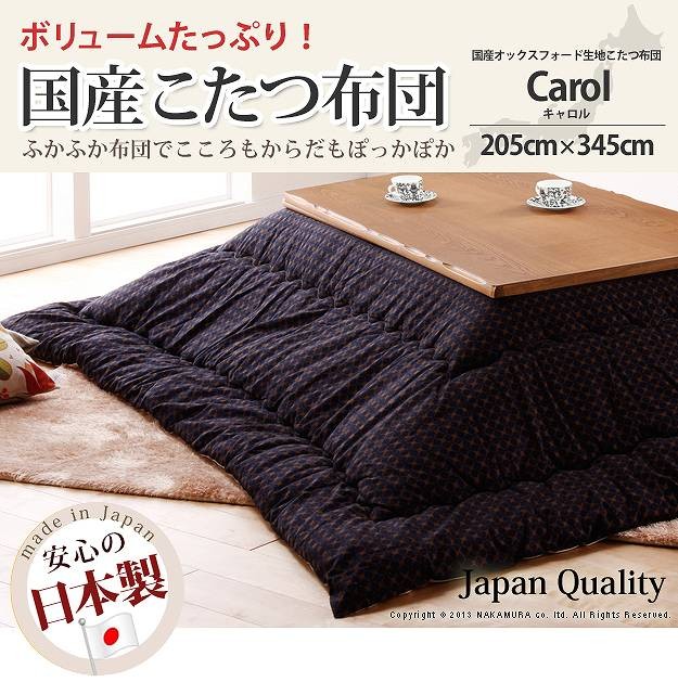 商品について:クッションやカバーにも使われる綿100%の丈夫な国産オックスフォード生地を使用した日本製のこたつ布団です。国内工場で綿入れ・縫製をしたこだわりの一品☆ボリュームたっぷり!すみまでしっかり綿が入ったふっかふかのこたつ布団です。