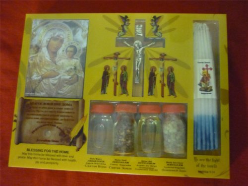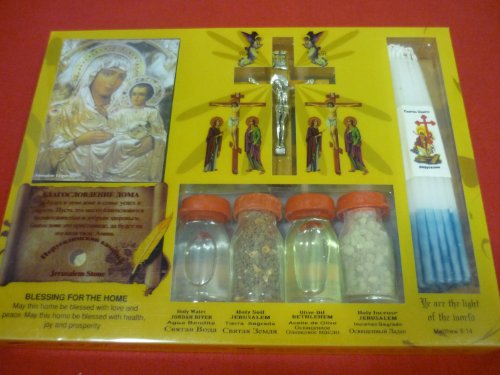 Product: This Sacred Contains Pure Water from Jordan River,Genuine Earth from Jerusalem.Virgin Olive from Bethlehem. Frank increse Holy Candles and holy insence including Jerusalem Virgin Mary with baby jesus icon,Crucifix and small Jerusalem Stone
