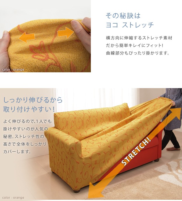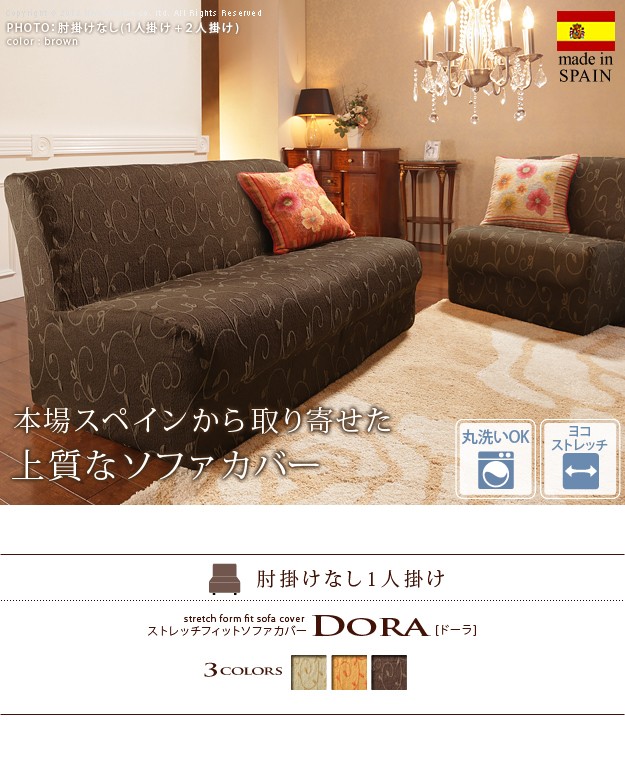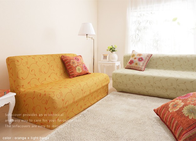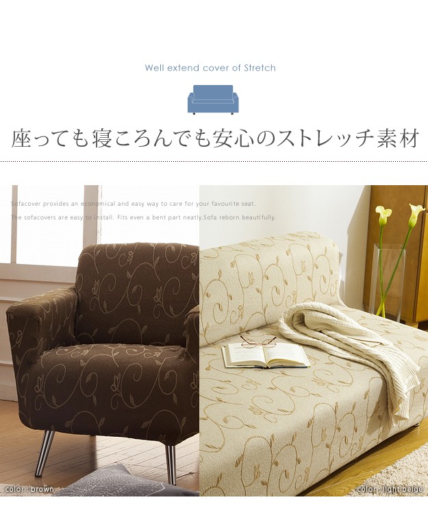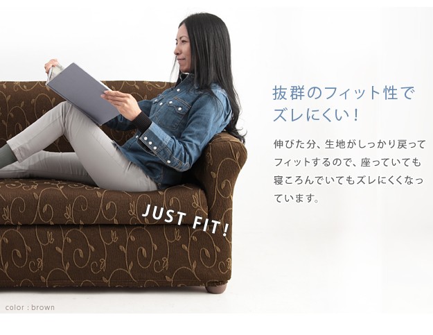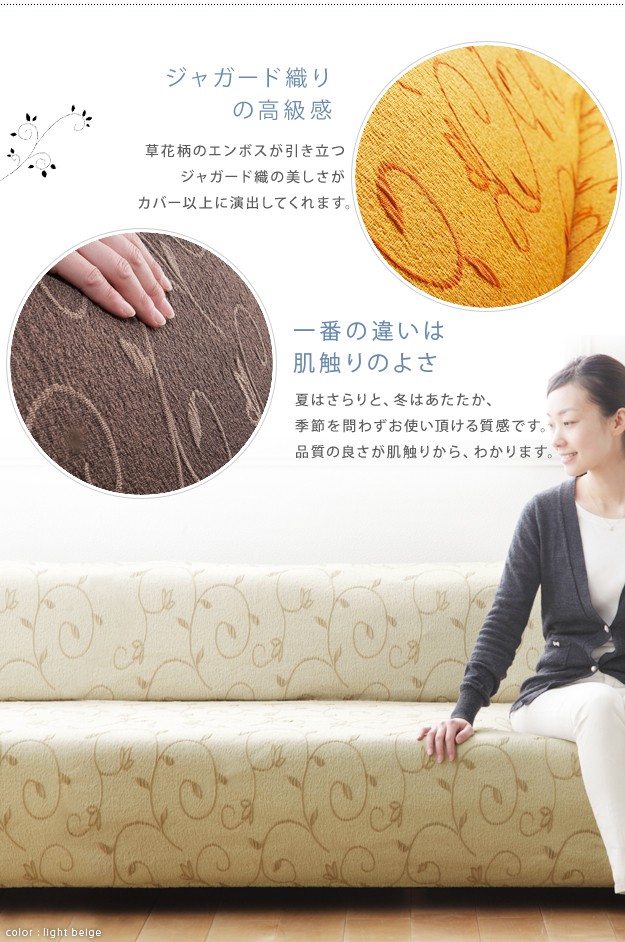 商品について:ジャガード織りの高級感あるスペイン製のソファカバー。横方向のストレッチ生地で高いフィット感です。控えめな草花柄がすっきりとした印象です。