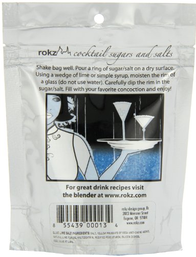 -. Binding : Grocery -. Brand : Rokz Design Group -. EAN : 7152555206543 -. Feature : Add color and flavor to margaritas / A blend of fine salts infused with lime flavor / Simply wet the edge of your glass and dip into the salt for a new twist on the usual garnish / Rokz cocktail effects cocktails will never be the same -. Label : Rokz Design Group -. Manufacturer : Rokz Design Group -. Model : NA -. MPN : #NA -. NumberOfItems : 1 -. PackageQuantity : 1 -. PartNumber : #NA -. ProductGroup : Grocery -. ProductTypeName : GROCERY -. PublicationDate : 2013-02-22 -. Publisher : Rokz Design Group -. Size : 5 Ounce -. Studio : Rokz Design Group -. Title : Rokz Design Group Salt, Blue Margarita, 5 Ounce -. UPC : 855439000134