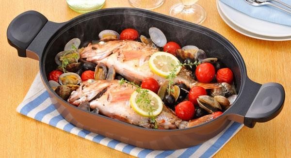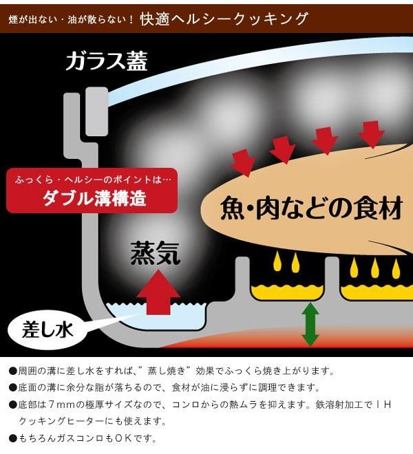 | お魚やお肉を丸ごと焼きたいオーバルタイプ☆ガス火でもIHでも使えます。余分な脂が凹凸に落ちるのでヘルシー♪ |