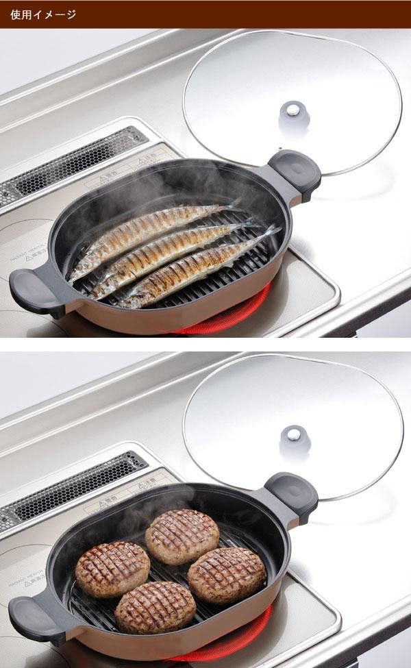 お魚やお肉を丸ごと焼きたいオーバルタイプ☆ガス火でもIHでも使えます。余分な脂が凹凸に落ちるのでヘルシー♪ |