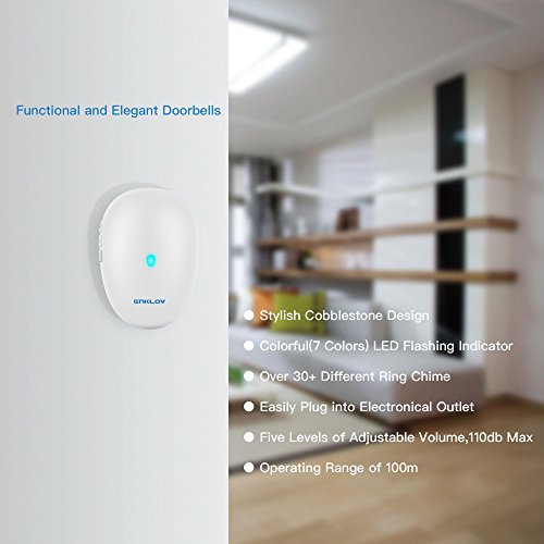 BASICS: Most sleek plug in chime receiver and touchscreen door bell button, over 30classis and modern chime melodies with superb sound quality,5 levels adjustable volume up to 100db lound sound, features with ture 100 meter operating range, Colorful LED alert indicator and so much more;