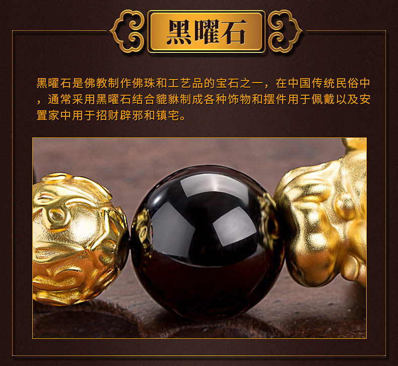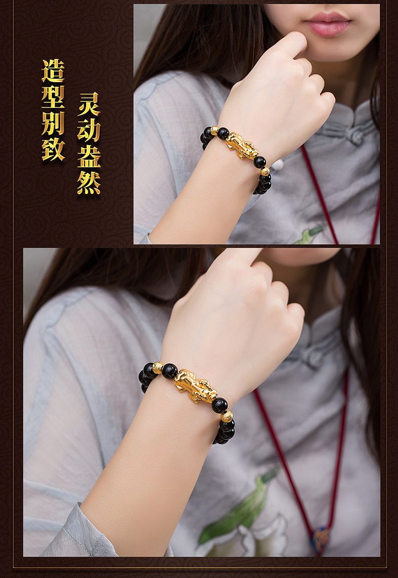 晶湖硬黄金越南绒沙金手串招财貔貅黑曜石手链佛珠足金男女款手串