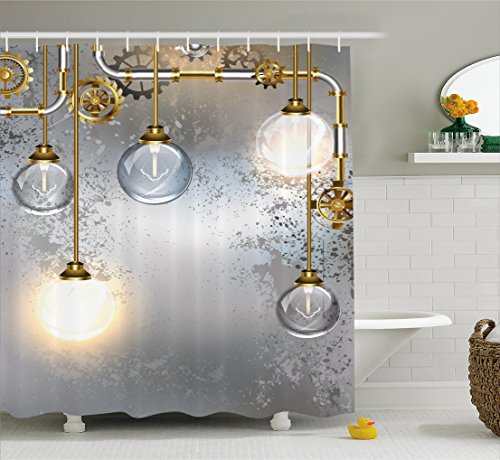 Industrial Decor Shower Curtain by Ambesonne, Steampunk Antique Composition Brass Fastening Round Figures Print, Fabric Bathroom Decor Set with Hooks, 70 Inches, Gold Grey White