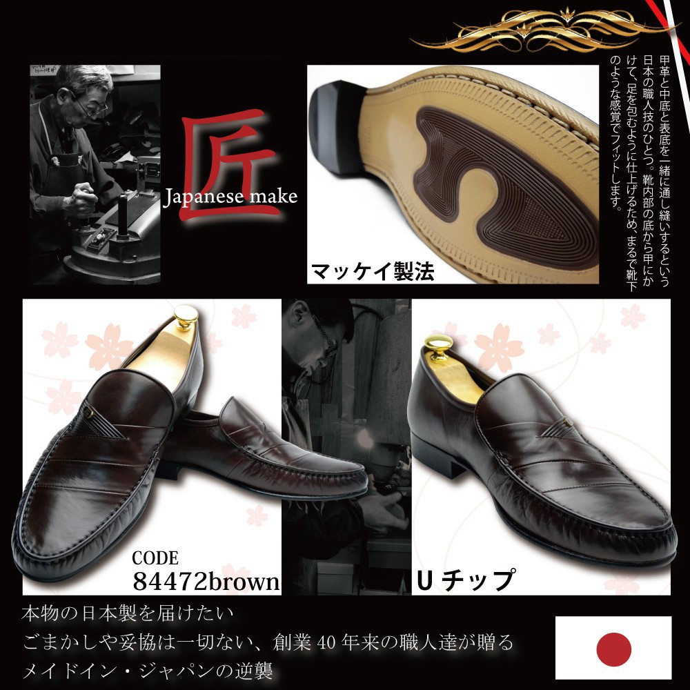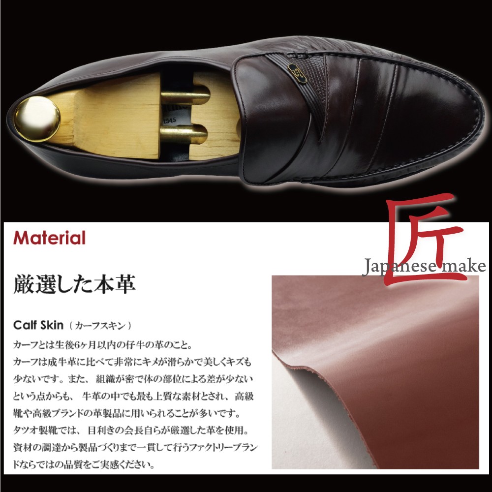 アッパー:本革 キップスキン (製造過程において、革質を厳選した際にキップもしくはカーフへと変更になる場合がございます。) 本底:本革+ゴム底 |