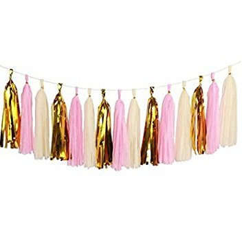 Sorive 15 X Pink Ivory Gold Tissue Paper Garland Wedding Birthday Party Baby Shower Decoration Bunting Pom Pom,Tissue paper tassels ( Pink Ivory Gold)