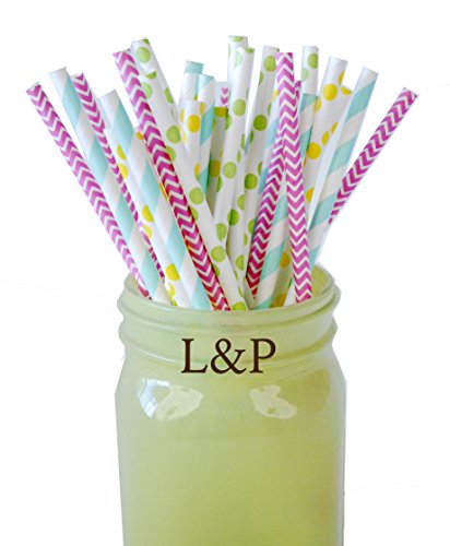-. Title : Easter Color Apple Green, Aqua, Yellow and Hot Pink Paper Straw Combo with Stripes, Polka Dot, and Chevron Design 100 Pk