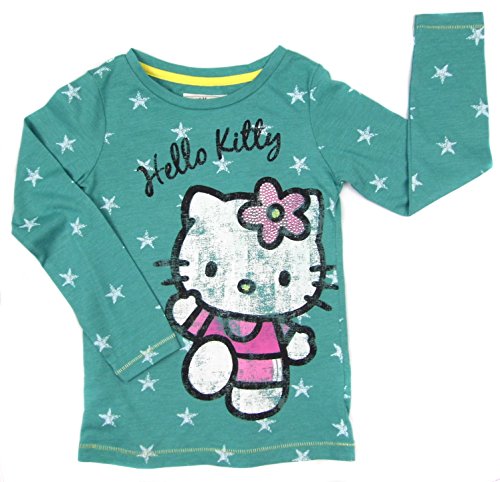 Ex Store N*Xt. Lovely quality top but the labels have been removed and the store name crossed out with black pen. Fantastic green top with white star multi print pattern. A bold picture of Hello Kitty is on the front of the top with her wearing a pink sports kit . A pink studded bow decorates her head . A funky top finished in a distressed style print . Ages 3 years up to 16 years.Feature