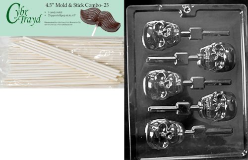 Cybrtrayd 45St25-H121 Scary Skull Lolly Halloween Chocolate Candy Mold with 25 4.5-Inch Lollipop Sticks