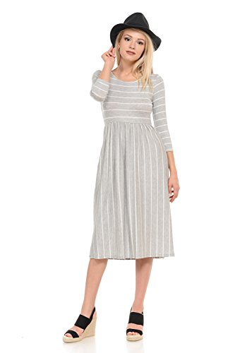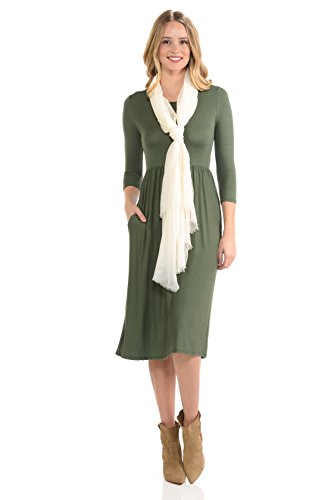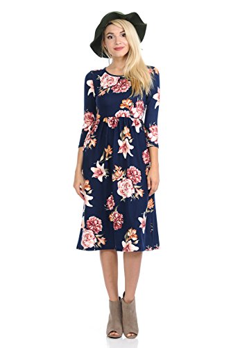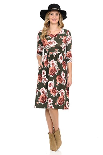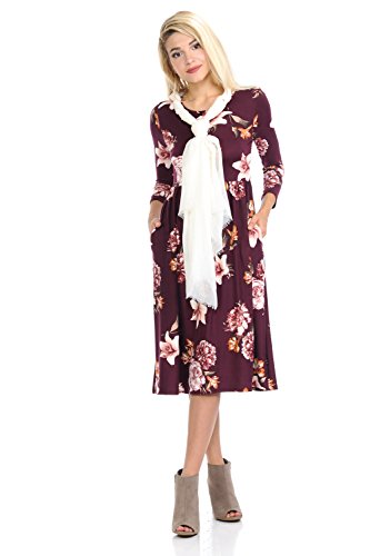 This cute dress features three quarter sleeves, rounded neckline, midi length, concealed side pockets and flared skirt. It is made with soft jersey knit that has great stretch.