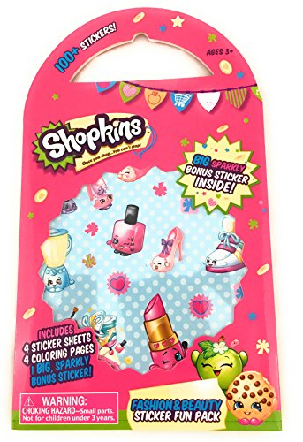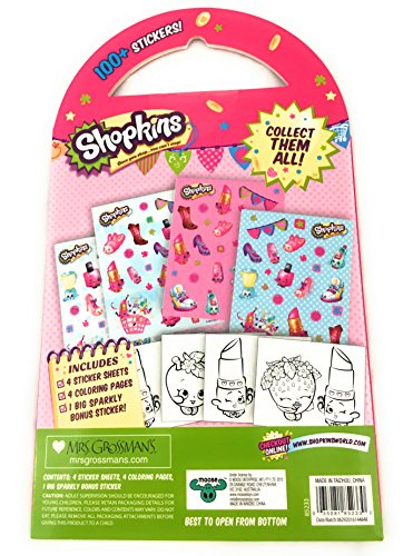 Bundle includes: one 12 Pack, one 5 Pack, one 2 Pack Mystery Box, 100+ Shopkins stickers (styles vary), 4 Coloring Pages and 1 Big Sparkly Sticker!