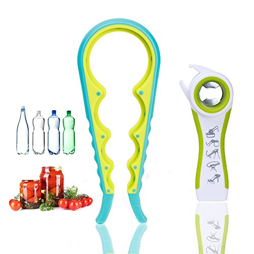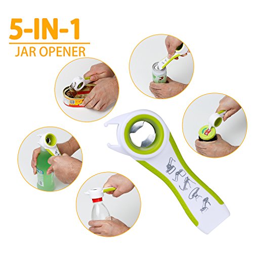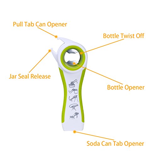 Features: Save your fingers and nails. With solid and non-slip grip design. Instatly removes food seals and pull tabs. Comes with 5-in-1 bottle opener and 4-in-1 jar opener. Made up of food grade polypropylene and rubber material. This multi-function kitchen aid is easy to hold and handle. Solid and non-slip grip design, easy for opening multiple jars and bottles. Durable construction with 5 functions to open all kinds of tight jars, cans and water bottles. Makes the perfect gift for all ages, especially for those with limited hand strength mobility or arthritis sufferers.