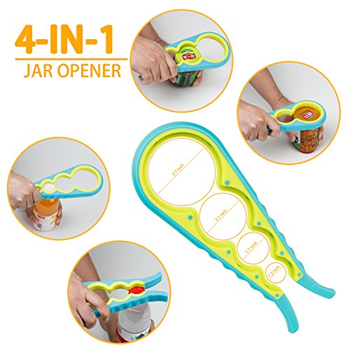 4-in-1 Jar opener: this jar opener with 4 different jar grips, easy tearing, pulling, turning and twisting for anything you crave, the large opener can gauge any lid or cap size, also you can open a soda, a juice or something like pickles with the same tool
