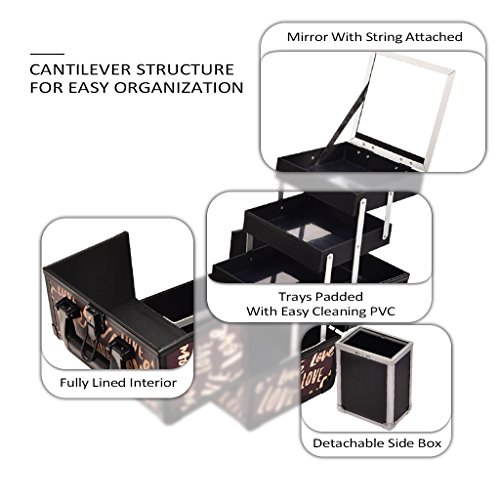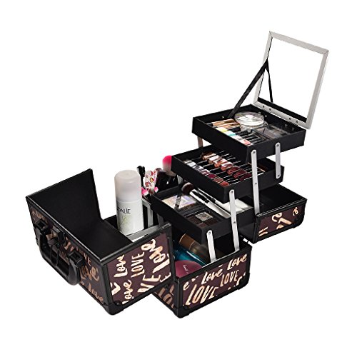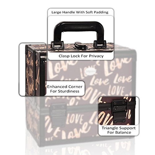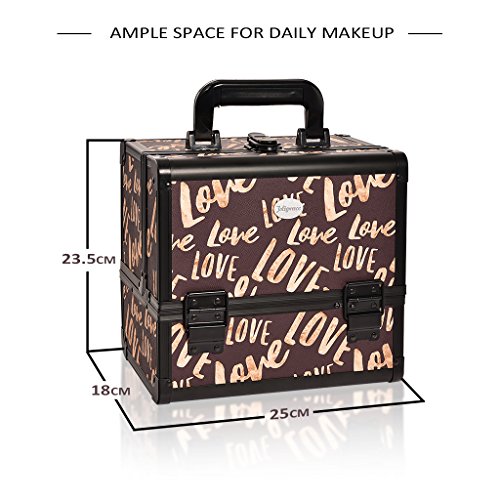JOLIGRACE Makeup Train Case Cosmetic Organizer Box Lockable with 3 Trays and a Brush Holder Brown (Love Pattern)