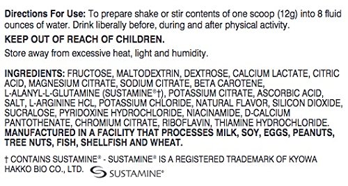 Studio : AdvoCare Publisher : AdvoCare Binding : Health and Beauty Product Description Helps replace minerals and electrolytes lost through sweat and supports recovery after a workout using vitamins, minerals, carbohydrates, Sustamine® and a blend of important electrolytes. AdvoCare Rehydrate® provides the nutrients to help maintain proper metabolism, delay the onset of fatigue, and hydrate your body by re-establishing your electrolyte balance. Rehydrate has a 1:1 ratio of sodium and potassium, two of the most vital electrolytes lost when we sweat. Overall, Rehydrate includes antioxidants (vitamins A and C), carbohydrates, electrolytes, Sustamine® and other nutrients that effectively promote optimal hydration and recovery. Sustamine® is a patented ingredient that works on multiple levels to help rehydrate the body and sustain energy levels during exertion. Clinically tested, Sustamine® is produced through a patented fermentation method to create a unique dipeptide that is more easily absorbed by the body than complex protein molecules. This makes Sustamine® a highly effective ingredient for hydration, endurance and recovery. DIRECTIONS For ages 4 and older. To prepare, shake or stir contents of one pouch or scoop into 8 fluid ounces of water. Drink liberally before, during and after physical activity 0
