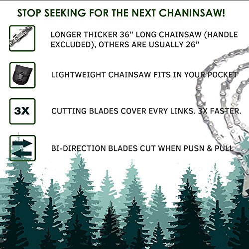 - TWO WAY BI-DIRECTIONAL cutting teeth reduces binding and hang ups, Available with a 24” or 36" chain saw chain; superior to cable, wire and rope saws; handsaws are made of heat treated high strength carbon alloy and steel for long lasting durability; super strong ballistic nylon straps.