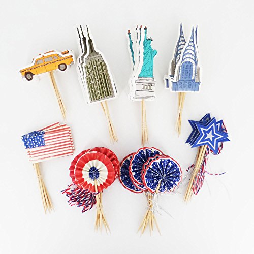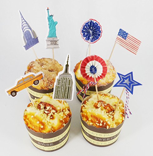 Yunko 48 Pcs Welcome to America Fun Cupcake Decorative Toppers Cupcake Decorating Tools for Party: Bicycle-Taxi-Stars and Stripes-Statue of Liberty-Chrysler Building