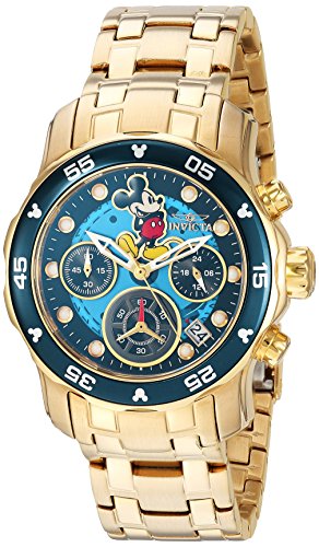 Invicta 24130 Disney Limited Edition chronograph women's dive watch features a 38mm wide and 13mm thick yellow gold plated solid stainless steel case with a blue accented gold tone unidirectional rotating bezel and textured push-pull crown with function pushers. Invicta 24130 is powered by a reliable Japanese TMI VD53 quartz chronograph movement. This beautiful watch also features a sharp looking Mickey mouse printed blue dial with white accents gold tone luminous skeleton hands and dot hour markers along with the chronograph, 12/24-hour time and date display functions, scratch resistant flame fusion crystal and water resistant to 200 meters. Invicta 24130 is equipped with a 20mm wide yellow gold plated solid stainless steel bracelet with a fold over safety lock clasp. Invicta 24130 women's Disney Edition chronograph blue dial yellow gold steel bracelet dive watch is brand new and comes in an original Invicta gift box and is backed by a 5 year limited warranty.Feature