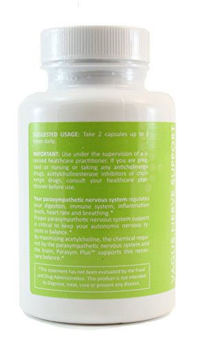 -. Binding : Health and Beauty -. EAN : 0645871766466 -. Feature : Patented Formula / Maximizes acetylcholine levels essential to inflammation control, brain support, normal digestion, and relaxation / Gentle and safe / Highest quality ingredients / Gluten free vegetarian capsules. Product is free of sucrose, starch, nuts, yeast, artificial flavors and colors -. Label : TJ Nutrition -. LegalDisclaimer : These statements have not been evaluated by the Food and Drug Administration. This product is not intended to diagnose, treat, cure, or prevent any disease. -. Manufacturer : TJ Nutrition -. PackageQuantity : 60 -. ProductGroup : Health and Beauty -. ProductTypeName : HEALTH_PERSONAL_CARE -. Publisher : TJ Nutrition -. Studio : TJ Nutrition -. Title : Parasym Plus -. UPC : 645871766466