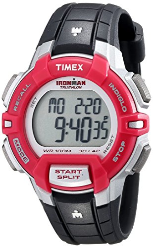 Timex T5K811 Ironman chronograph women's 30 lap watch features a 42mm wide and 12mm thick silver resin case with a fixed pink bezel and textured function pushers. Timex T5K811 is powered by quartz chronograph movement. This beautiful watch features a sharp looking grey digital dial with black Arabic digital numerals along with the chronograph, alarm, date-day and month display functions. This watch also features Indiglo night-light, 100-hour chronograph with lap or split in large digits, 30-lap memory recall with 99-lap counter, and 24-hour countdown timer with countdown/stop and countdown/repeat, scratch resistant acrylic crystal and water resistant to 100 meters. Timex T5K811 is equipped with a 14mm wide black resin strap with a buckle clasp. Timex T5K811 women's Ironman 30 lap grey digital dial chronograph alarm watch is brand new and comes in an original Timex gift box and is backed by 1 year limited warranty.Feature
