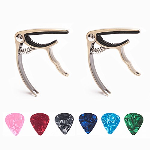 Specifications: Color: Gold/Black/Silver Size: 13*16*2cm Weight: 0.1KG Package Content: 1 Guitar Capo 6 Guitar Picks